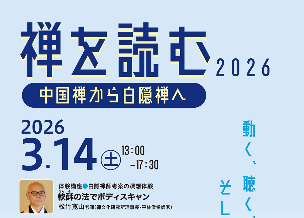 「ありのままでいい!」――「ありのままでいい?」 ひとくちに「禅」と言っても、いろいろです。「ありのままの自己をありのままに肯定する禅」、そして「ありのままの自己を打破して、悟りを追求する禅」。中国では、唐代の禅と宋代の禅が、日本では、江戸時代の盤珪の禅と白隠の禅が、それに当たります。禅門・学界で活躍中の講師陣とともに、ご自分の身体を動かしながら、禅の歴史と思想について楽しく考えてみましょう。●日時2026年3月14日(土)13:00~17:30●会場麟祥院〒113-0034 東京都文京区湯島4-1-8●タイムスケジュール13:00 開会1 .体験講座 白隠禅師考案の瞑想体験 軟酥(なんそ)の法でボディスキャン 松竹寛山老師(禅文化研究所理事長・平林僧堂師家)2.講義Ⅰ 唐代の禅問答を読んでみよう「カモは、飛んで、ドコへ行った?」 小川隆先生(駒澤大学総合教育研究部教授・駒澤大学禅文化歴史博物館館長)3.講義Ⅱ 宋代禅から白隠禅へ 無字(むじ)、そして隻手(せきしゅ) 柳幹康先生(東京大学東洋文化研究所准教授・花園大学国際禅学研究所副所長)4.講演 「ありのまま」を考える 盤珪(ばんけい)禅師と白隠(はくいん)禅師 横田南嶺老師(禅文化研究所所長・円覚寺派管長)5.座談会「中国禅から白隠禅へ」17:30頃 閉会主催:禅文化研究所 協力:花園大学国際禅学研究所・臨済会●定員80名●参加費●一般:8,000円●禅文化研究所賛助会員および学生〔いずれもご本人のみ〕:5,000円●申込方法ホームページよりオンライン申込お申し込みは→こちら