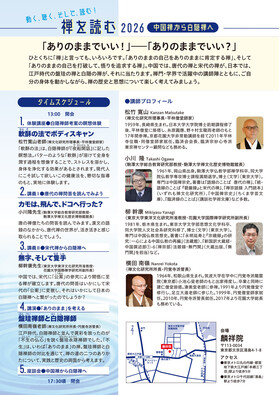 「ありのままでいい!」――「ありのままでいい?」 ひとくちに「禅」と言っても、いろいろです。「ありのままの自己をありのままに肯定する禅」、そして「ありのままの自己を打破して、悟りを追求する禅」。中国では、唐代の禅と宋代の禅が、日本では、江戸時代の盤珪の禅と白隠の禅が、それに当たります。禅門・学界で活躍中の講師陣とともに、ご自分の身体を動かしながら、禅の歴史と思想について楽しく考えてみましょう。