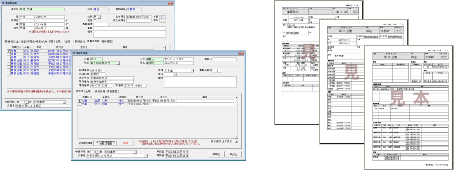 寺籍台帳、僧籍台帳、寺院の情報と従事している僧侶の情報を組み合わせた寺籍僧籍台帳など、合わせた台帳が印刷できます。そのほか、寺籍住所録や宛名シールの印刷も可能です。