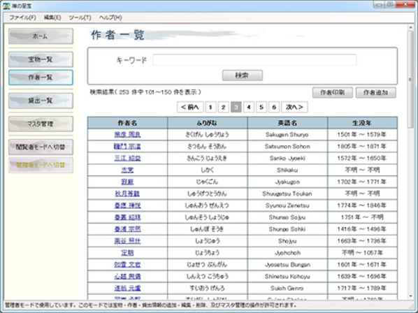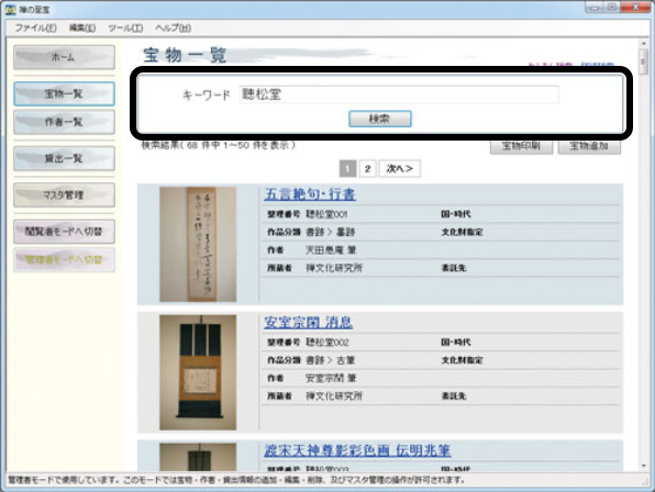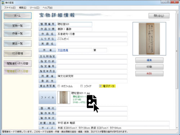 「宝物管理システム 禅の至宝」は、各宗派の本山・寺院及び関係機関が所有する宝物・什物などの目録及びそれに関する画像等をデジタル的に保存することを趣旨とし、禅芸術・禅文化を将来に伝えるべく、共通の指針の上で情報を整備していくことを目的としたアプリケーションです。
