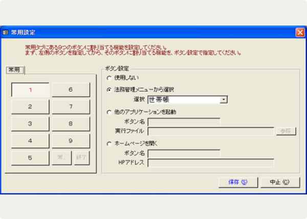 常用メニューにある9つのボタンの機能をユーザーが自由に設定できるようになります。 法務管理メニューにあるものはもちろんのこと、他のアプリーションを起動することや、URLを指定しておいてホームページを開くということも設定できます。