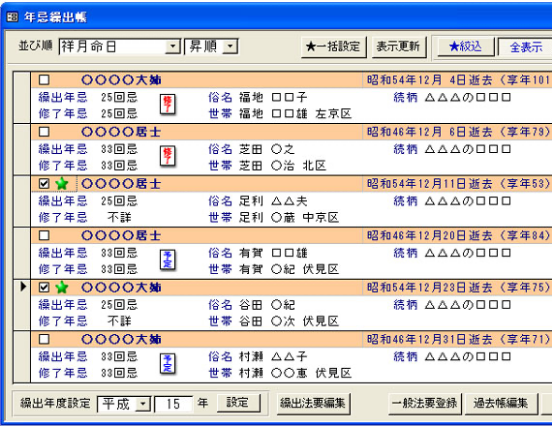 ver.1の時には規程の年忌法要の管理しかできませんでした。今度は地方で行なわれている特殊な年忌(61回忌など)、何回忌でもユーザーが自由に設定できます。もちろん、その呼称も変更可能。また、擔雪 II では、帰寂者に対して行なう一般法要(納骨法要など自由に登録)や、現在帳登録者に対して行なう一般法要(星祭りや仏前結婚式など自由に登録)ができます。