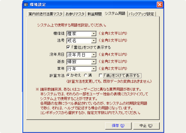 諸宗教諸宗派や地方、寺院などによって異なるシステム上での用語を変更することができます。例えば、「檀信徒」を「檀家」に変えたり、「法号」を「戒名」に、「享年」を「行年」になど、自由に設定可能。印刷はもちろん、システム上のコンボボックスやラベル表示まで変更され、どんな宗派でも違和感なくご使用頂けます。また享年の計算方法を数え歳か満か、また「歳」を付けるか付けないというような細かな設定もできます。