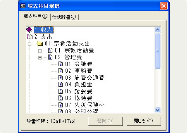 見通しよく選択入力ができ、自動仕訳入力も可能です。 収支科目設定の検索キーを利用し、例えば、税理士さんと予め取り決めてある収支科目コードを設定して、科目の簡単入力が可能です。