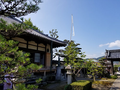 上の写真に見えている、招き幡。往生呪が書かれているのですが、もう一本、本堂の裏手にもあげています。この幡、去年のお盆のあと下ろしてみたら、経年劣化でビリビリに破れてしまっていました。そこで布地を買って檀家さんに動力ミシンで縫って貰い、閑栖和尚に揮毫して貰って新調したものです。