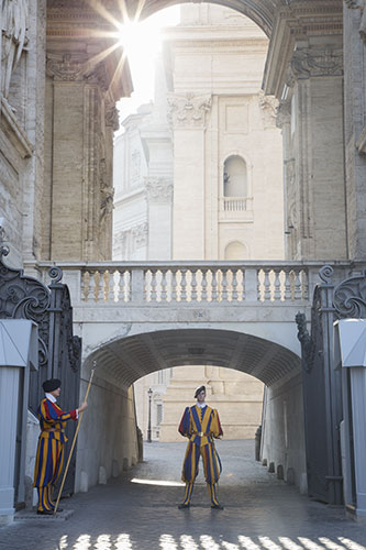表に出ると、スイスの衛兵がローマ法王と宮殿を護衛していました。ものすごくユニークな制服ですね。
