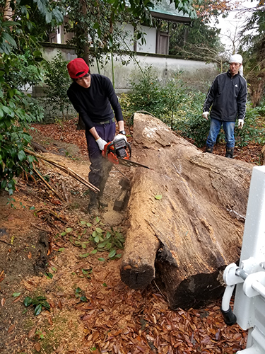 そこで、クレーン重機(ユニック)を持っている、いつもお世話になっている石材店さんにお願いし、また、このままではトラックにも積めないほど大きいことから、少し切り分ける必要があるため、檀家さんの息子さんで森林組合に勤めるM君に大きなチェンソーをもって出てきて貰い、搬出の手はずを整えました。