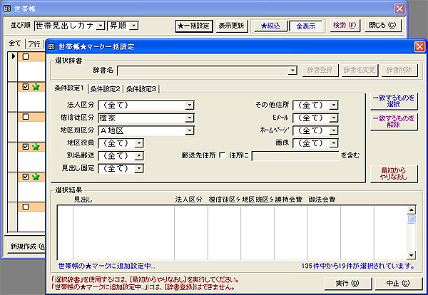 例えば、檀家のみの世帯リストを作成したり、ある地区の世帯に対して宛名ラベルを印刷したりできます。